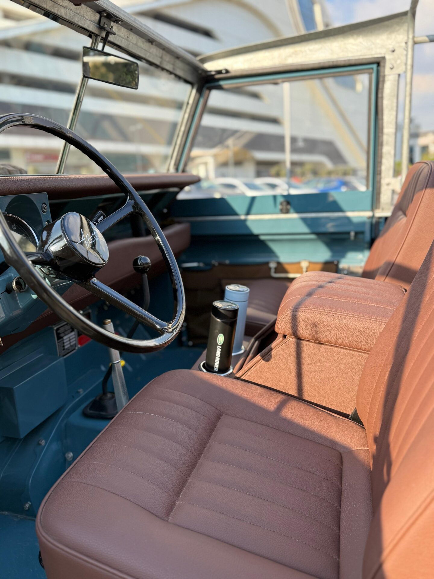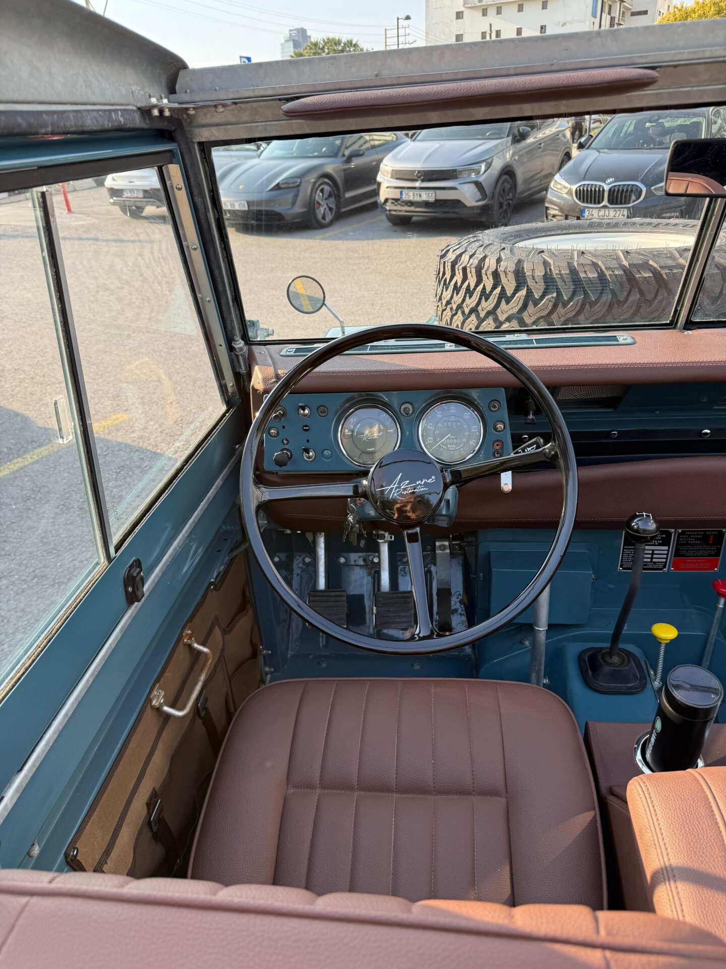 Inside, the Series III features Azure brown fireproof leather upholstery, including rear seating, paired with a piano black Azure steering wheel and original Land Rover gauges and heater system. The new professional-grade wiring harness ensures reliability, while the teak marine cargo floor and waxed brown canvas soft top add a timeless aesthetic. Additional details include galvanized hood sticks, stainless fasteners throughout, and new 235/85R16 tires (2024) mounted on Wolf perforated alloy wheels. The exhaust system is brand new, completing the restoration.