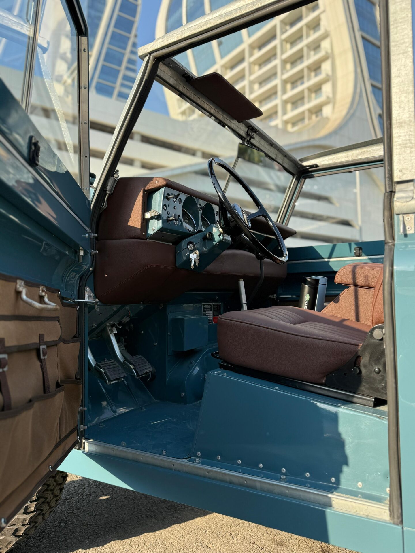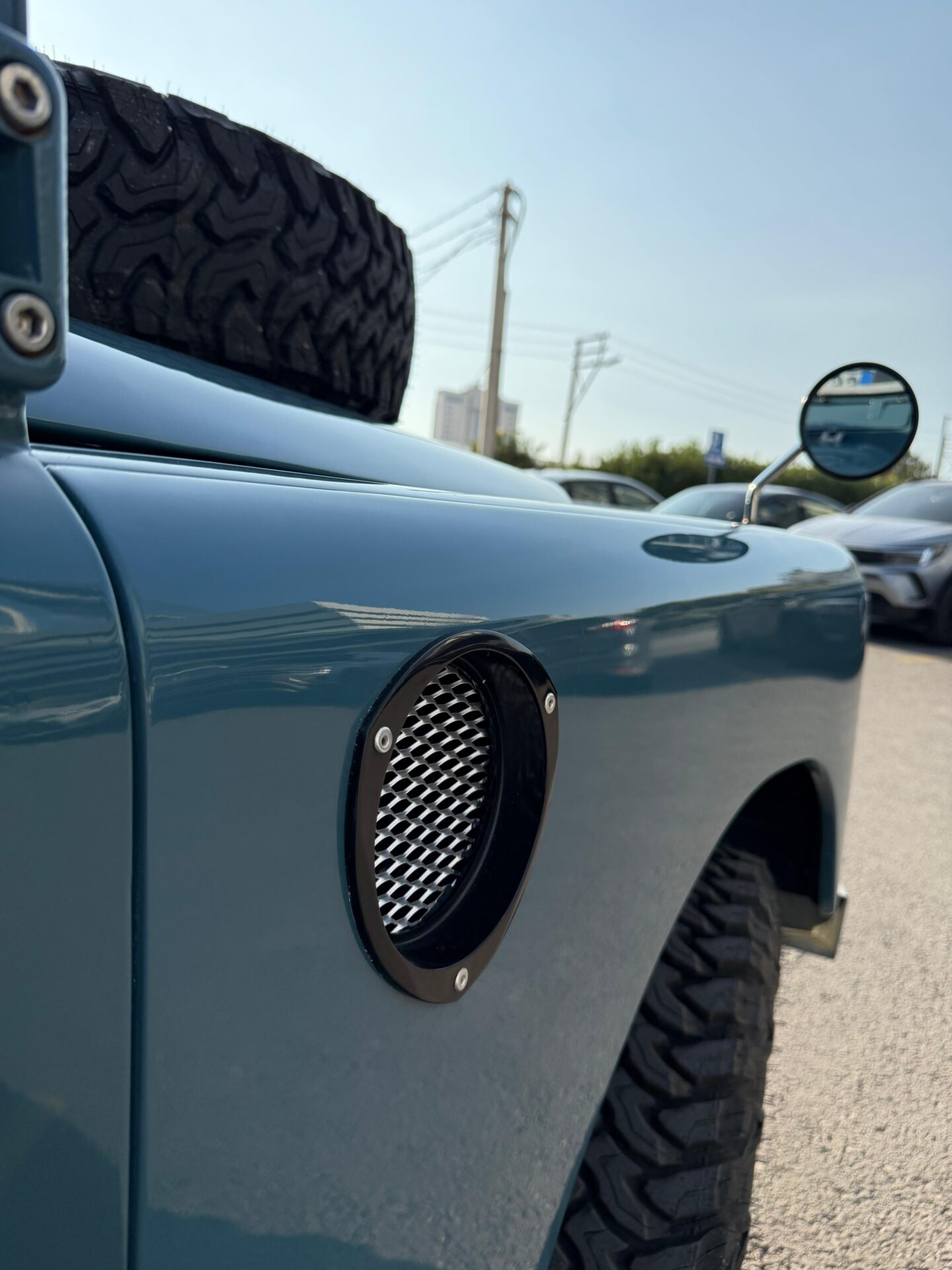 The bodywork is entirely new, hand-built from scratch. All body bolts are stainless steel, and the steel panels were hot-dip galvanized before paint. The bonnet features a custom handmade spare wheel carrier, a process that alone took over 25 days to complete. The frame and fittings were sealed and coated to prevent oxidation, ensuring long-term protection even in harsh conditions.